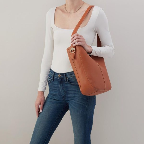 A leather shoulder bag with top handle option.
