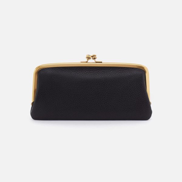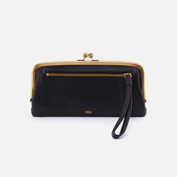 This large frame wallet doubles as a clutch thanks to the leather wristlet strap.