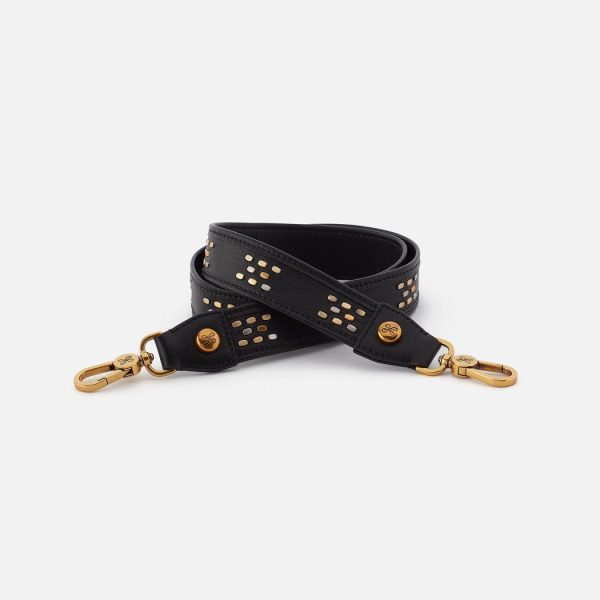 A leather guitar strap with a flat stud inlay detail.